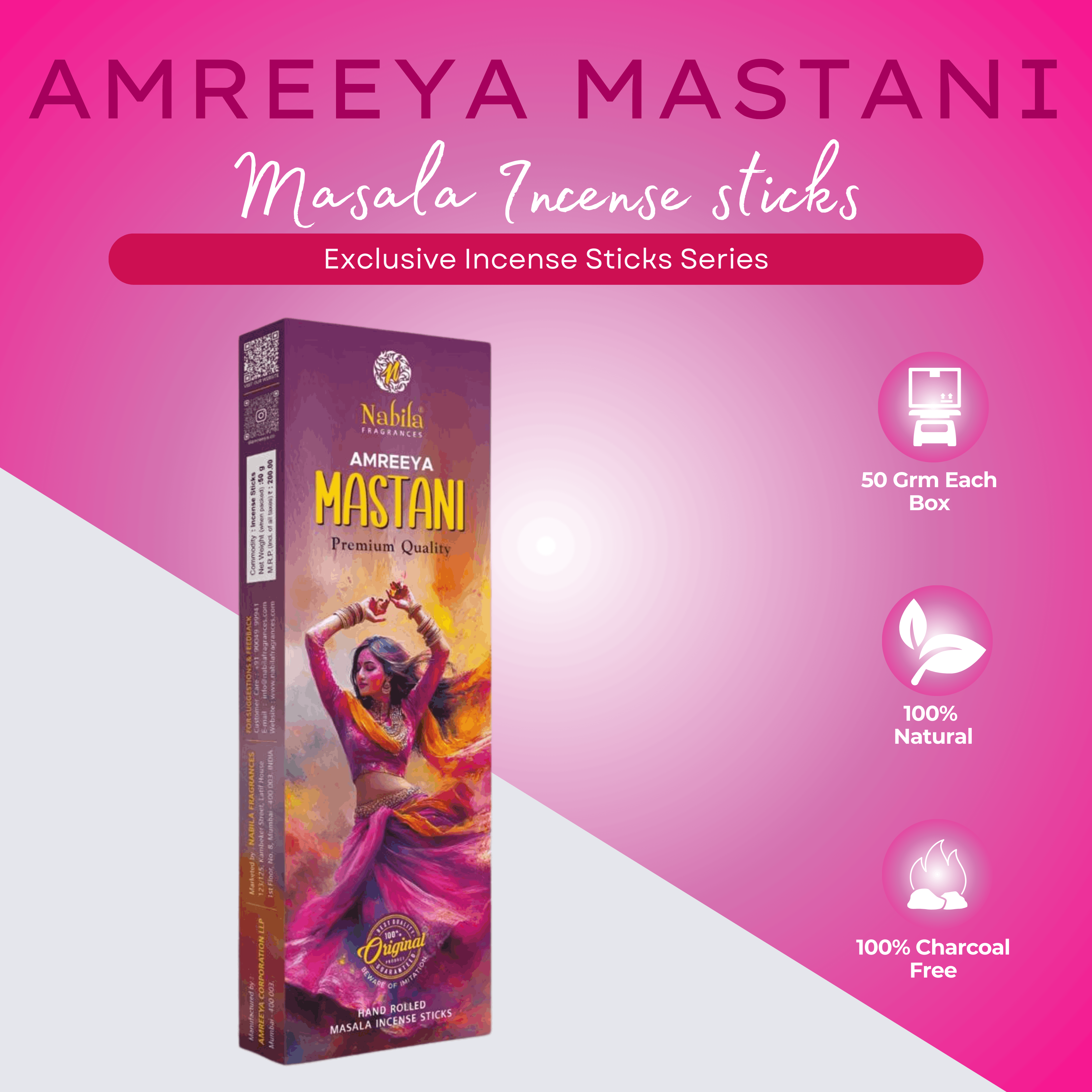 Each pack contains four 50 gram boxes of premium masala incense sticks, offering extended usage and excellent value. The sturdy, premium packaging protects the incense from moisture and environmental factors, ensuring long lasting freshness and aroma retention. The elegant design also enhances shelf appeal and reinforces the luxury positioning of the AMREEYA brand.