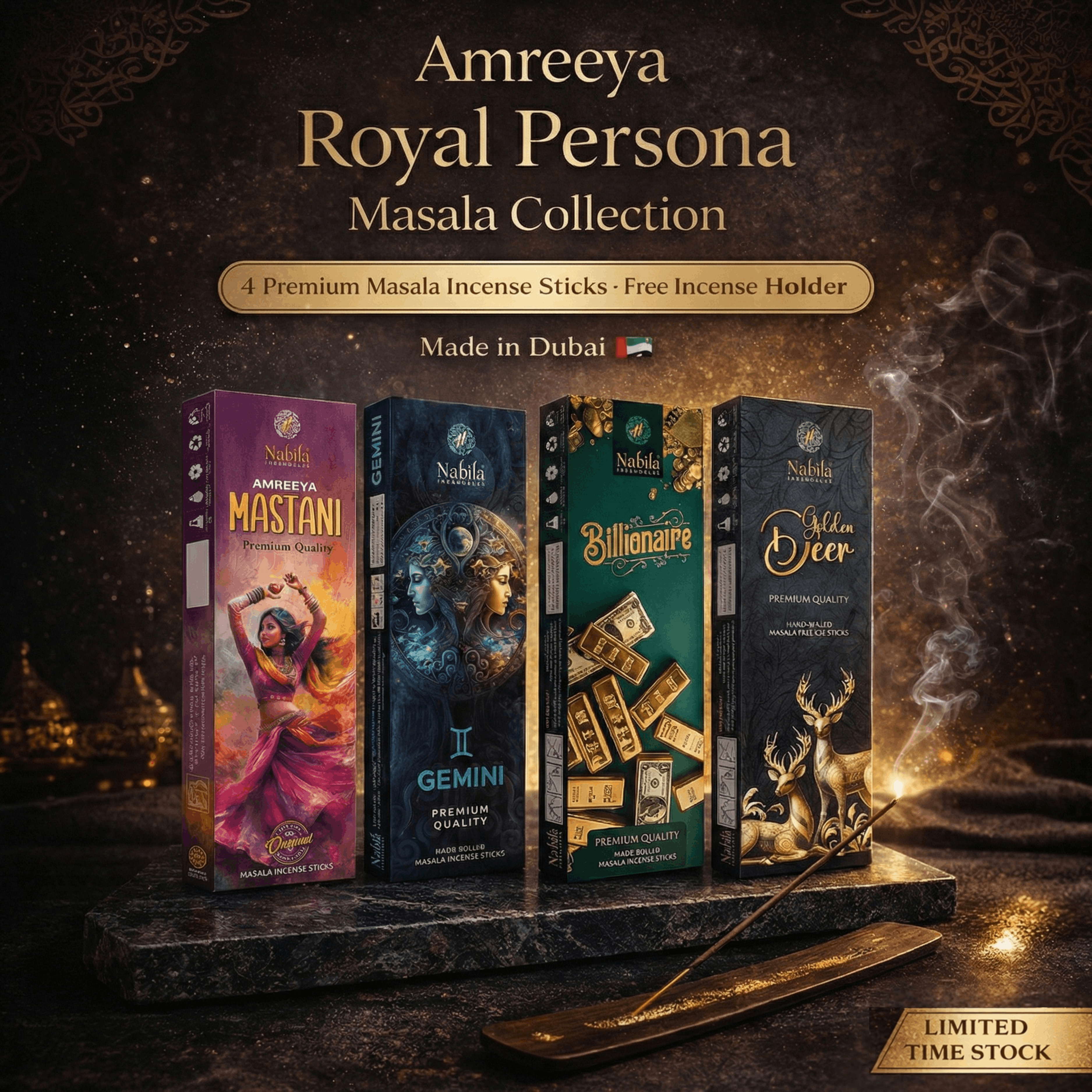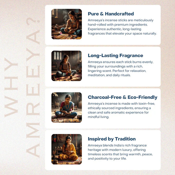 AMREEYA is committed to delivering incense products that combine purity, tradition, and modern luxury. The Royal Persona Masala Collection is crafted using carefully selected natural ingredients and premium fragrance compositions, free from harsh chemicals and charcoal. This ensures a safe, pleasant, and reliable incense experience for everyday use.